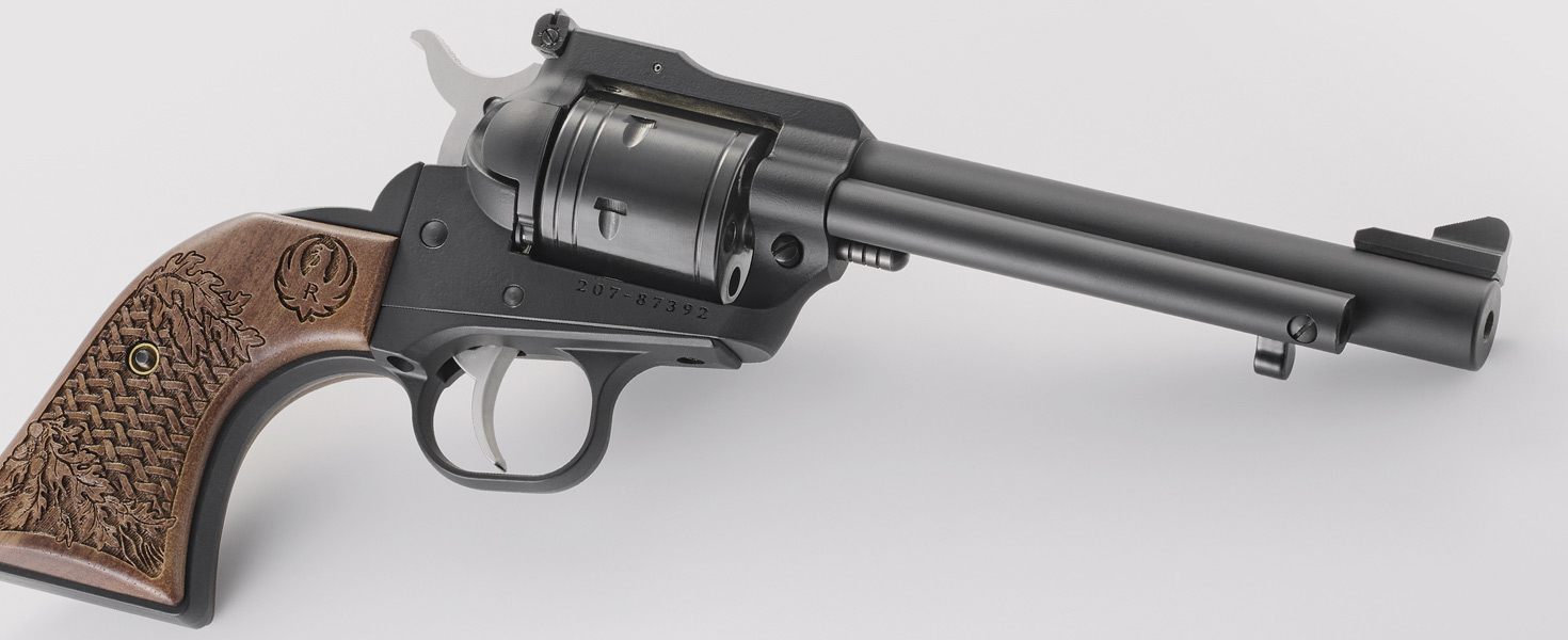 The Super Wrangler offers dual-caliber capability in 22 LR and 22 WMR using the included extra cylinder. The black Cerakote finish is matched with grip panels featuring the same oak leaf and basket weave design found across the Collector's Series models, giving this wheelgun a collector's touch.