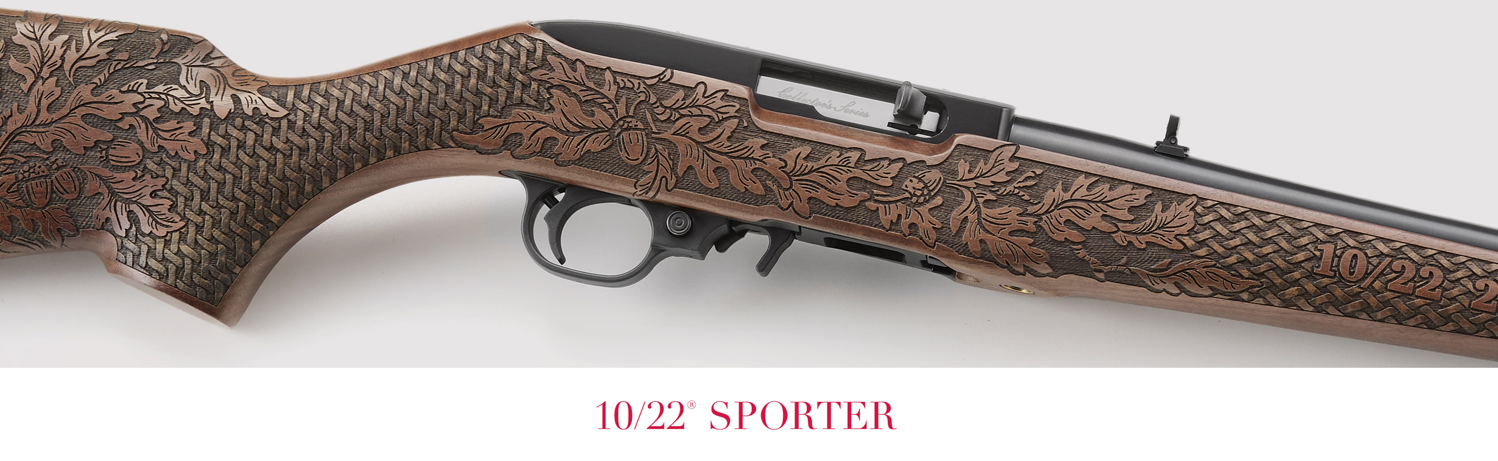 A new take on a timeless favorite, this 10/22 Sporter pairs the classic gold bead front sight, adjustable rear sight and traditional wood stock with an engraved oak leaf and basket weave design. Finished with a black satin barrel and Collector’s Series bolt marking, it’s a refined version of a legendary rimfire.