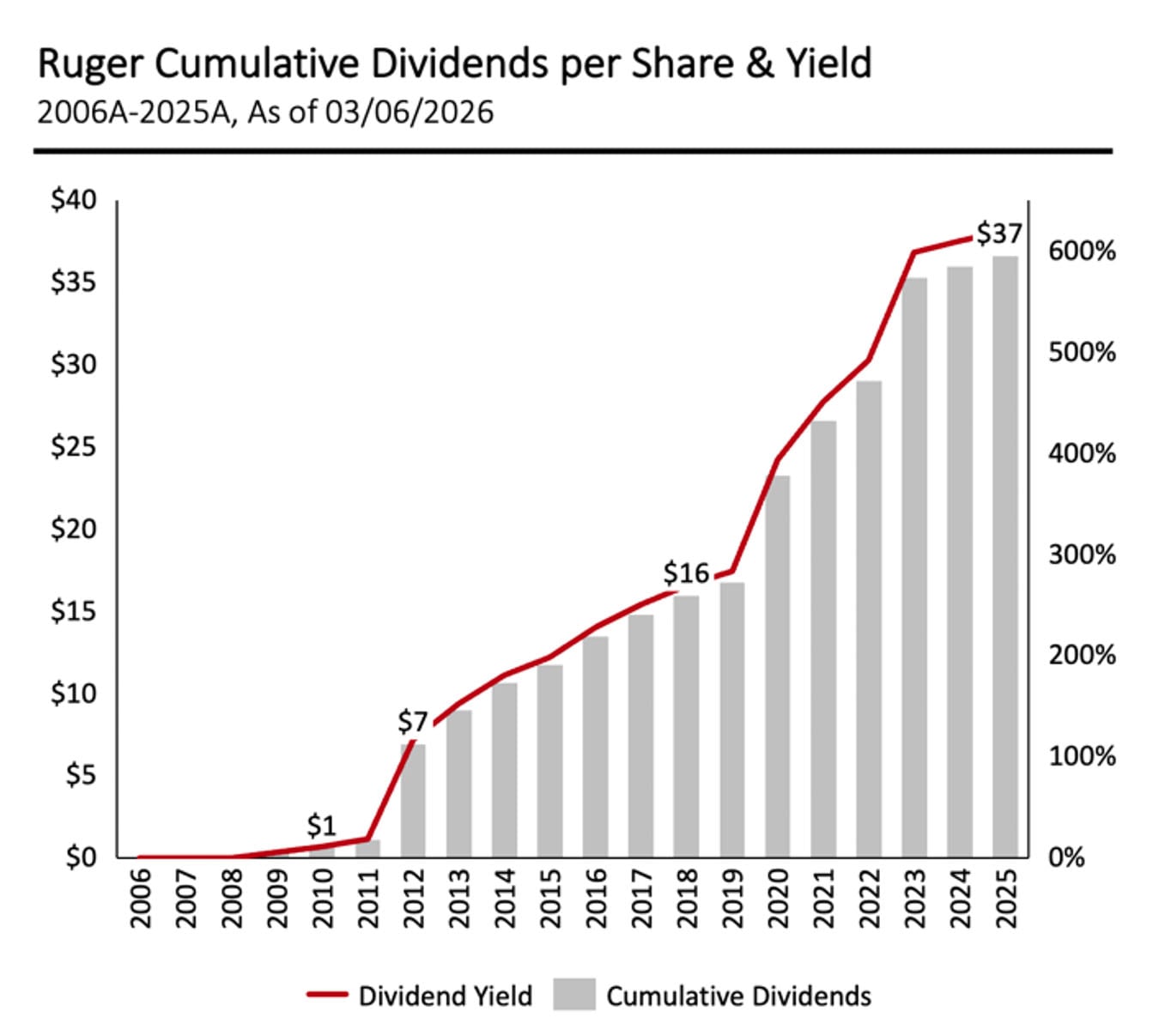 If you had invested $1,000 in Ruger in 2006, that investment would have had a total shareholder return of over $12,000 as of March 6, 2026, with roughly half of that value returned coming from Ruger's consistent, shareholder-friendly dividend policy. Cumulative dividends per share since 2006 grew to $37 by the end of 2025, equating to an approximate 600% cumulative dividend yield.