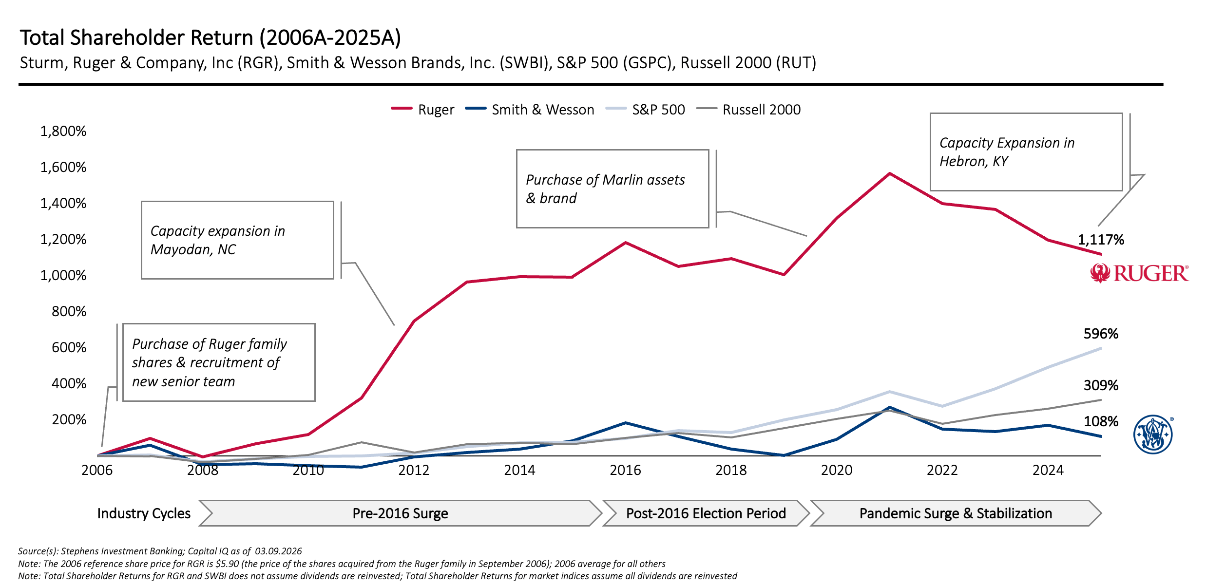 During that time, the Company invested meaningfully in the long-term strength of the business. By 2025, Ruger's TSR since 2006 had grown to 1,100%, exceeding the TSR of the S&P 500 and the Russell 2000 market indices and Smith & Wesson, the other leading U.S. firearms manufacturer.
