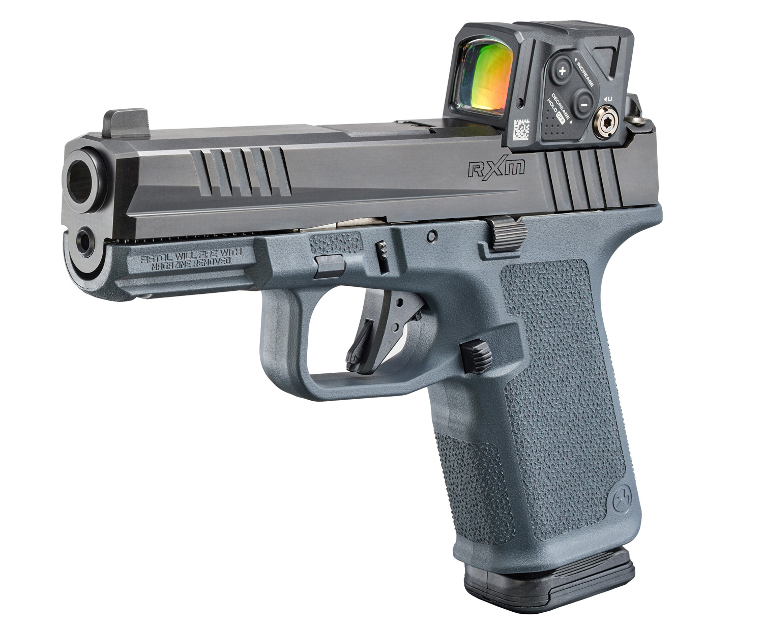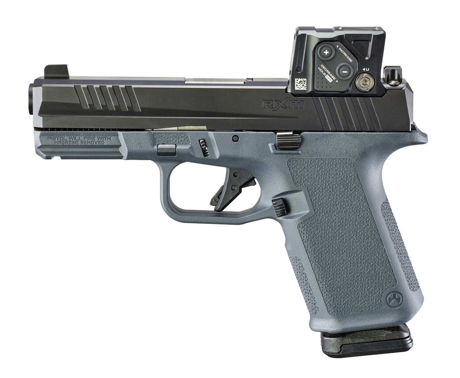 Extended magazine release and raised slide stop.