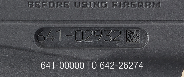 Potentially affected pistols include any Ruger-57 pistol with a serial number of 642-26274 or lower (including all Ruger-57 pistols with a “641” prefix). If your Ruger-57 pistol is within this range (641-00000 to 642-26274), you should follow the inspection procedure outlined below to determine whether your pistol requires a retrofit. Ruger-57 pistols with a serial number of 642-26275 and above are not affected by this Safety Bulletin.