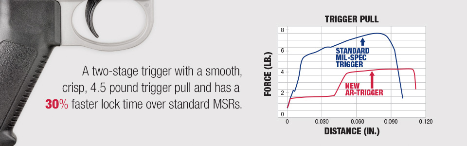 The Ruger® Elite 452® AR-Trigger is a two-stage trigger with a smooth, crisp, 4.5 pound trigger pull and has a 30% faster lock time over standard MSRs. This rugged, reliable and safe trigger is a Genuine Ruger® Factory Accessory, comes in a completely self-contained module and is easy to install.