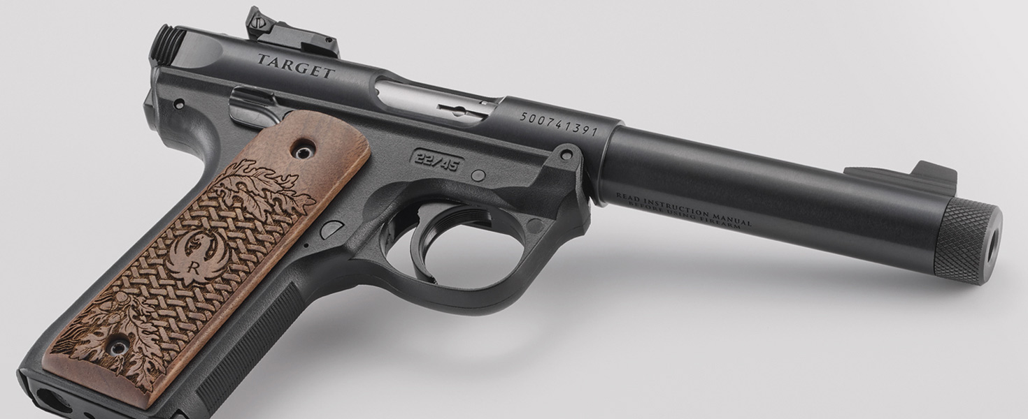 Like all models in the 22/45 line, this Mark IV features a blued barrel and 1911-style grip angle. It’s set apart by American walnut grips engraved with the oak leaf and basket weave pattern, adding a distinctive touch to this rimfire staple.