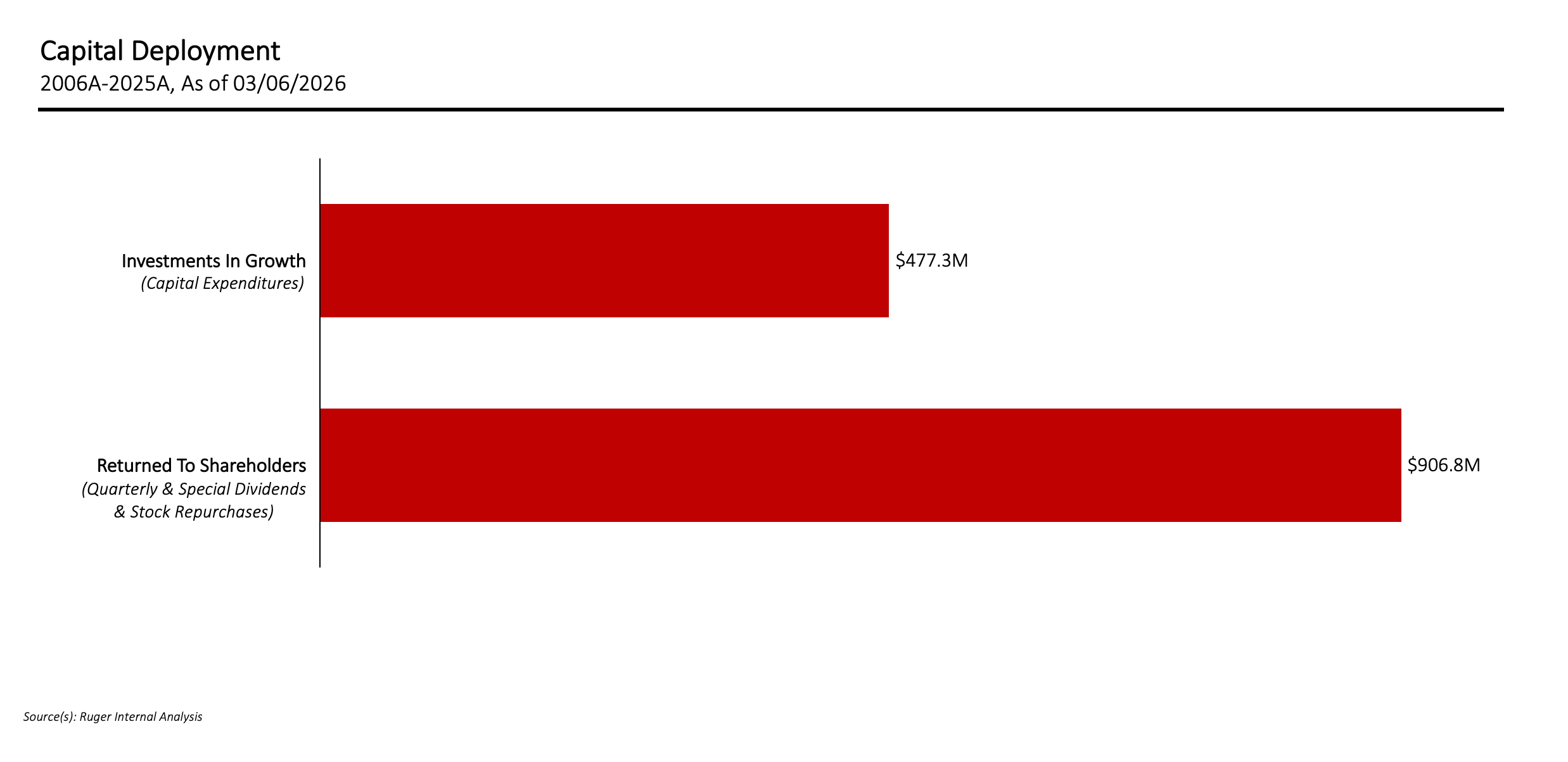 Since 2006, Ruger has returned more than $900 million to shareholders through quarterly dividends, special dividends and stock repurchases. Over the same period, the Company reinvested nearly $500 million in American manufacturing. The chart below illustrates Ruger’s strong performance and capital stewardship under the current Board’s leadership.