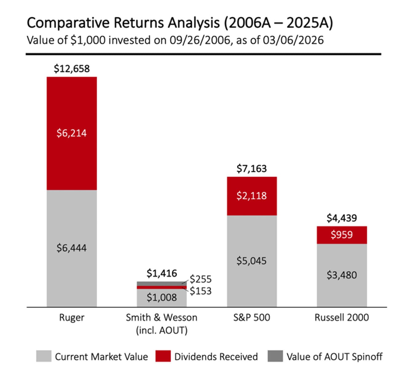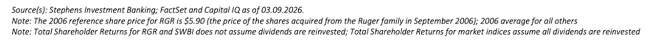 During that time, the Company invested meaningfully in the long-term strength of the business. By 2025, Ruger's TSR since 2006 had grown to 1,100%, exceeding the TSR of the S&P 500 and the Russell 2000 market indices and Smith & Wesson, the other leading U.S. firearms manufacturer.