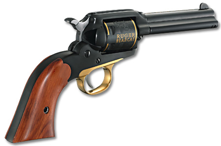 The blued, limited edition 50th Anniversary New Bearcat also features two gold bands and a gold-filled "RUGER BEARCAT" rollmark on the cylinder. The 4" barreled revolver, chambered for the popular and inexpensive .22 LR cartridge, will be shipped in a new gun rug bearing the Ruger logo, together with a detailed history booklet.