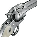 Like all Ruger New Vaquero revolvers, these are built on a mid-sized steel frame designed to offer the original "Old West" single-action look, size and feel. They have a patented Ruger reverse indexing pawl, which positively aligns the cylinder with the loading gate cutout for easy loading and unloading of cartridges. A beveled cylinder offers easier holstering and a larger crescent-shaped ejector rod head in traditional form makes the New Vaquero one of the most user-friendly single-action revolvers on the market.