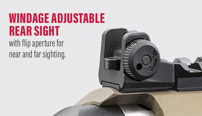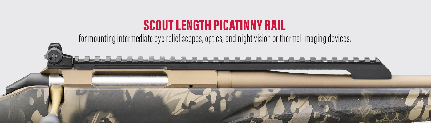 Generation II Scout models feature a scout length scope base for mounting intermediate eye relief scopes and optics while also including elevation and windage adjustable iron sights.
