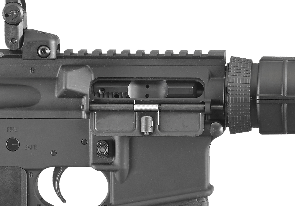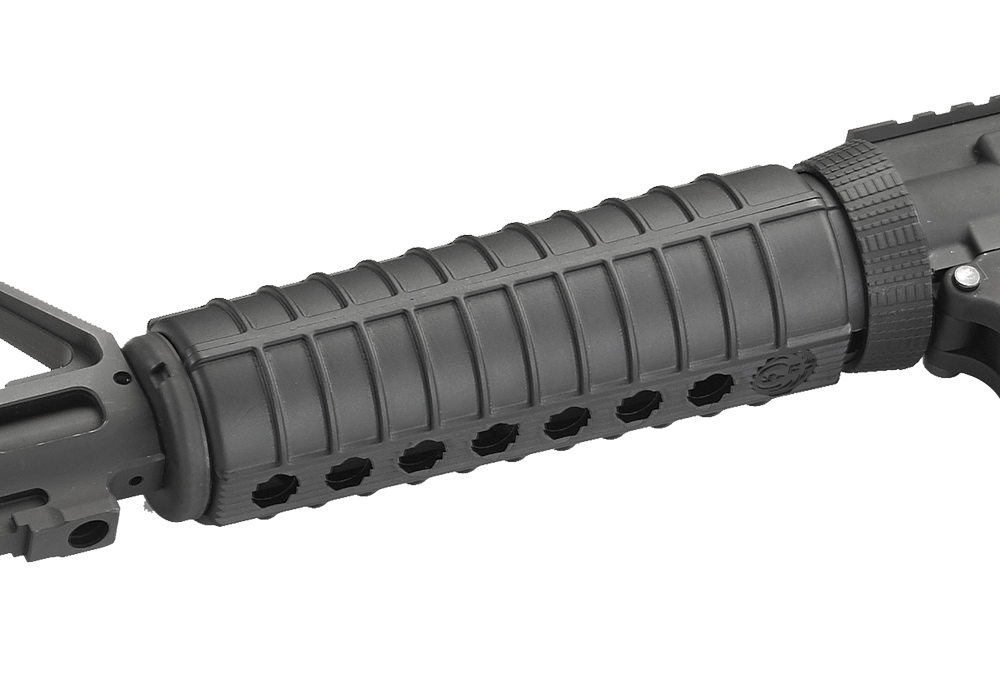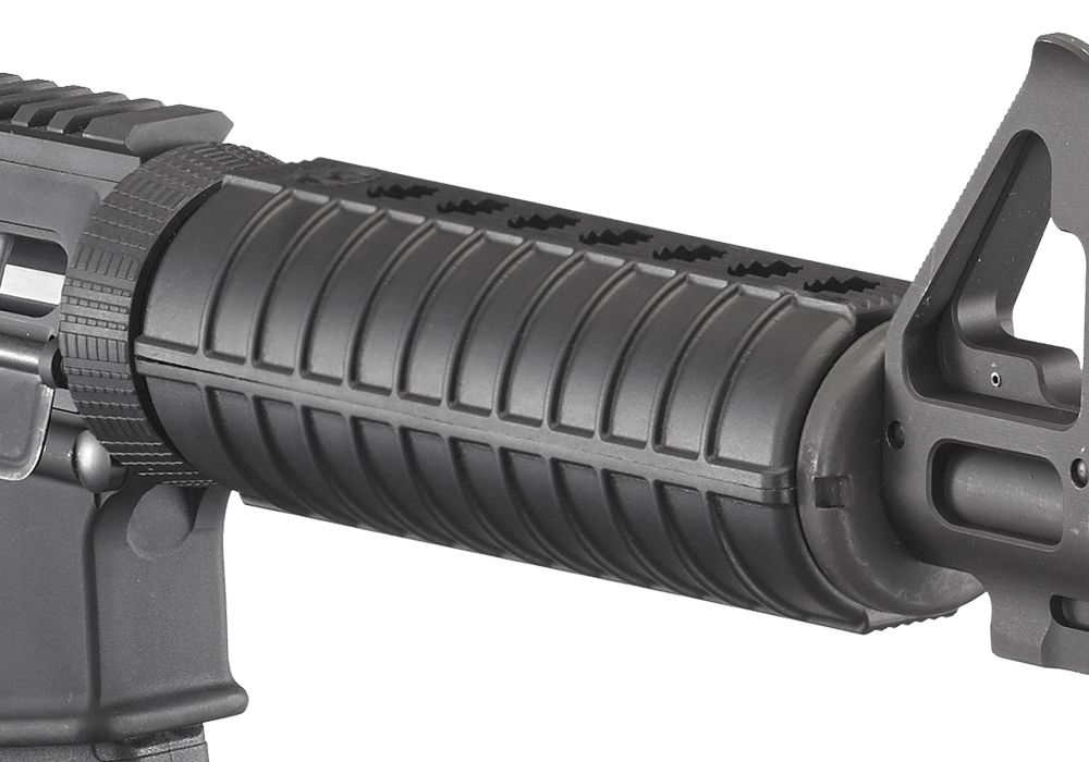 Barrel nut and delta ring allow easy, one-person service of the heat-resistant glass-filled nylon handguard. The design accepts most standard carbine-length handguards. The barrel nut uses a standard wrench.