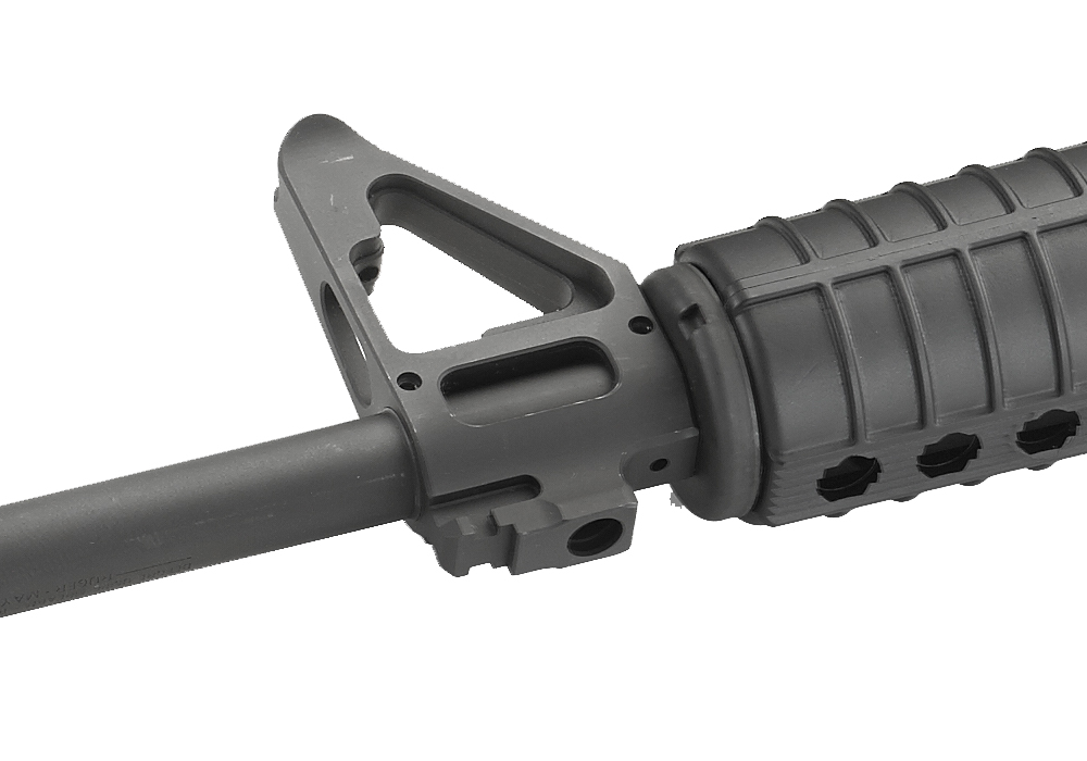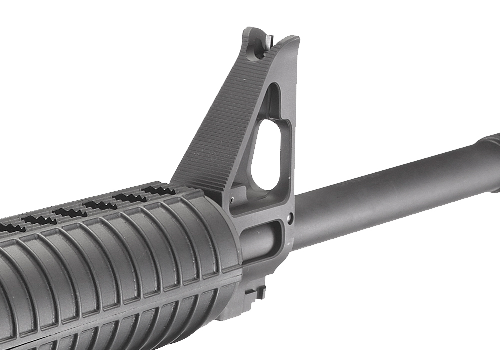 Gas block is located at a carbine-length (M4) position for improved balance and handling. Multiple attachment points include a QD socket and bayonet lug (excludes 8502), for many sling and accessory mounting options. Serrations on the angled face of the gas block provide a low-glare surface.