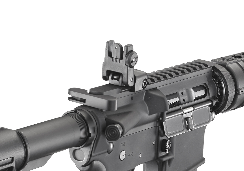 Ruger® Rapid Deploy folding rear sight provides windage adjustability and pairs with the A2-style, F-height, elevation-adjustable front sight for a solid, reliable aiming system.