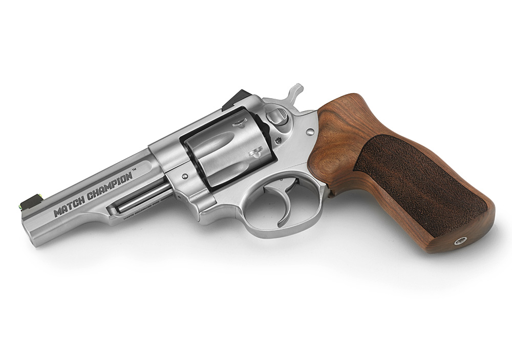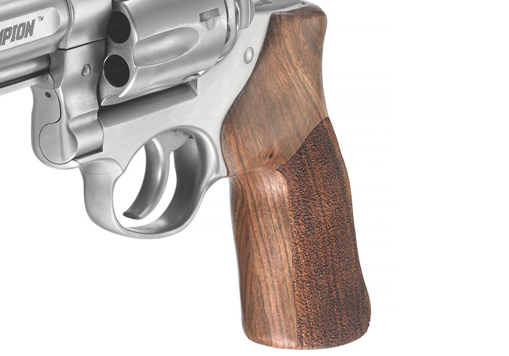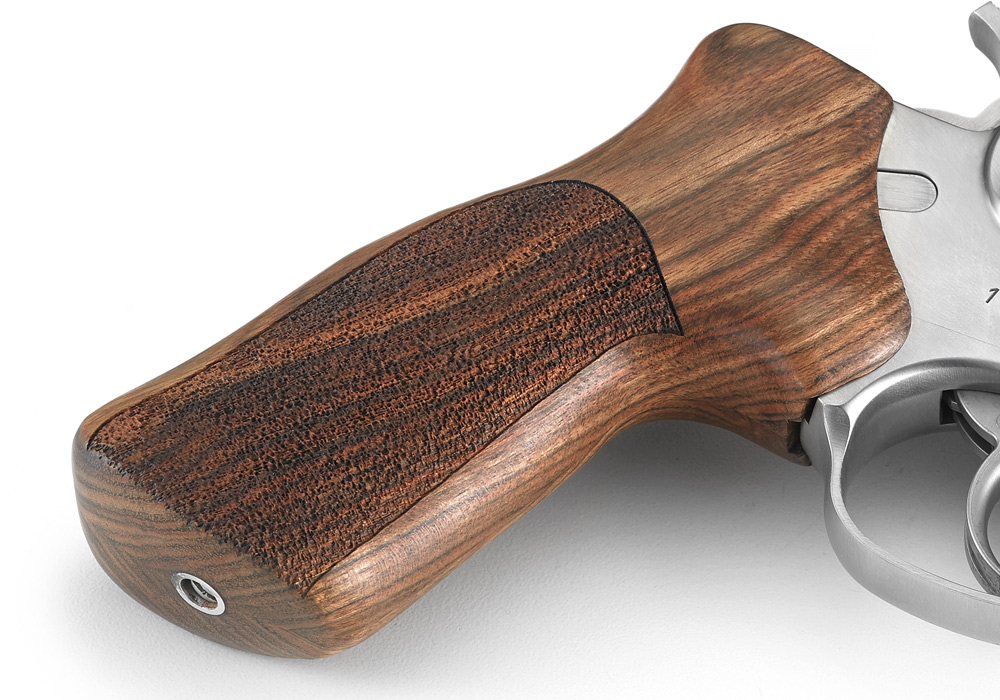 A custom Hogue® hardwood grip with stippled sides permits an ideal grip for competition shooting.
