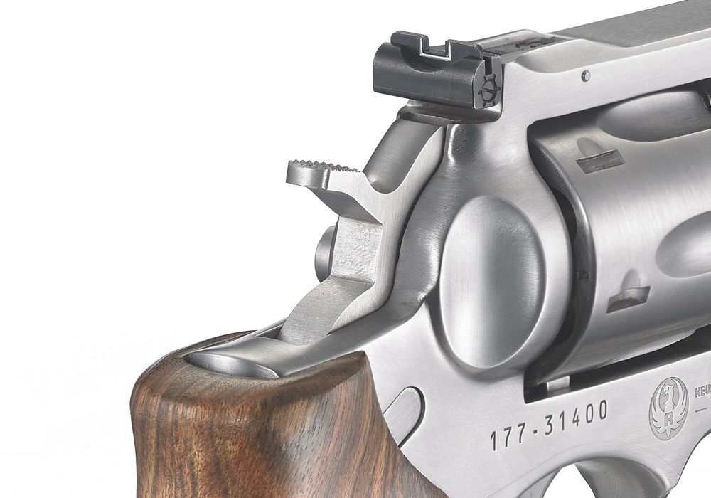 Triple-locking contoured cylinder is locked into the frame at the front, rear and bottom for more positive alignment and dependable operation shot after shot and enables easy re-holstering. The ejector and chamber mouths have a light chamfer to aid loading.