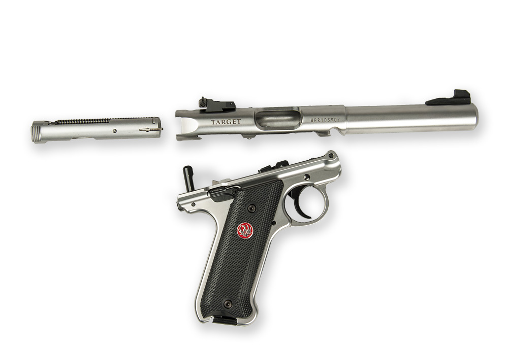 Simple, one-button takedown for quick and easy field-stripping and proper chamber-to-muzzle cleaning. Pressing a button in the back of the frame allows the barrel-receiver assembly to tilt up and off the grip frame without the use of tools.