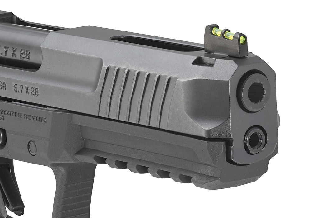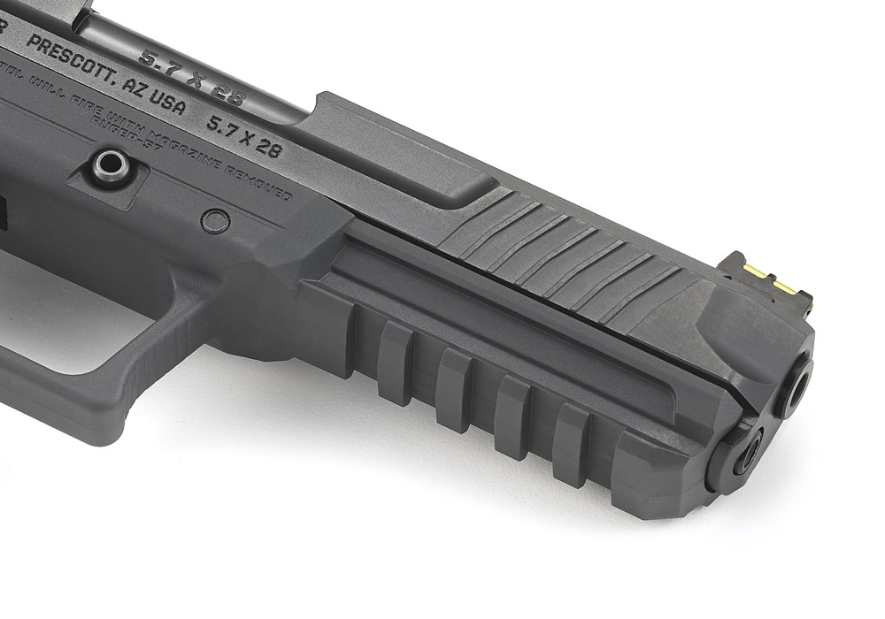 Through hardened, billet steel slide with lightening cuts is drilled and tapped for easy mounting of optics with separately available optic adapter plate, available at ShopRuger.com.