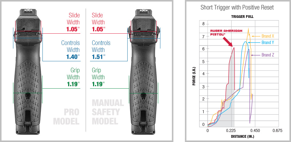 Safety features include internal, automatic sear block system, ambidextrous manual safety and integrated trigger safety. Pro Models come without manual safety.