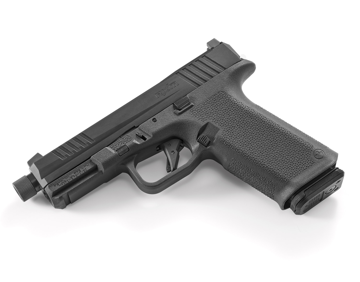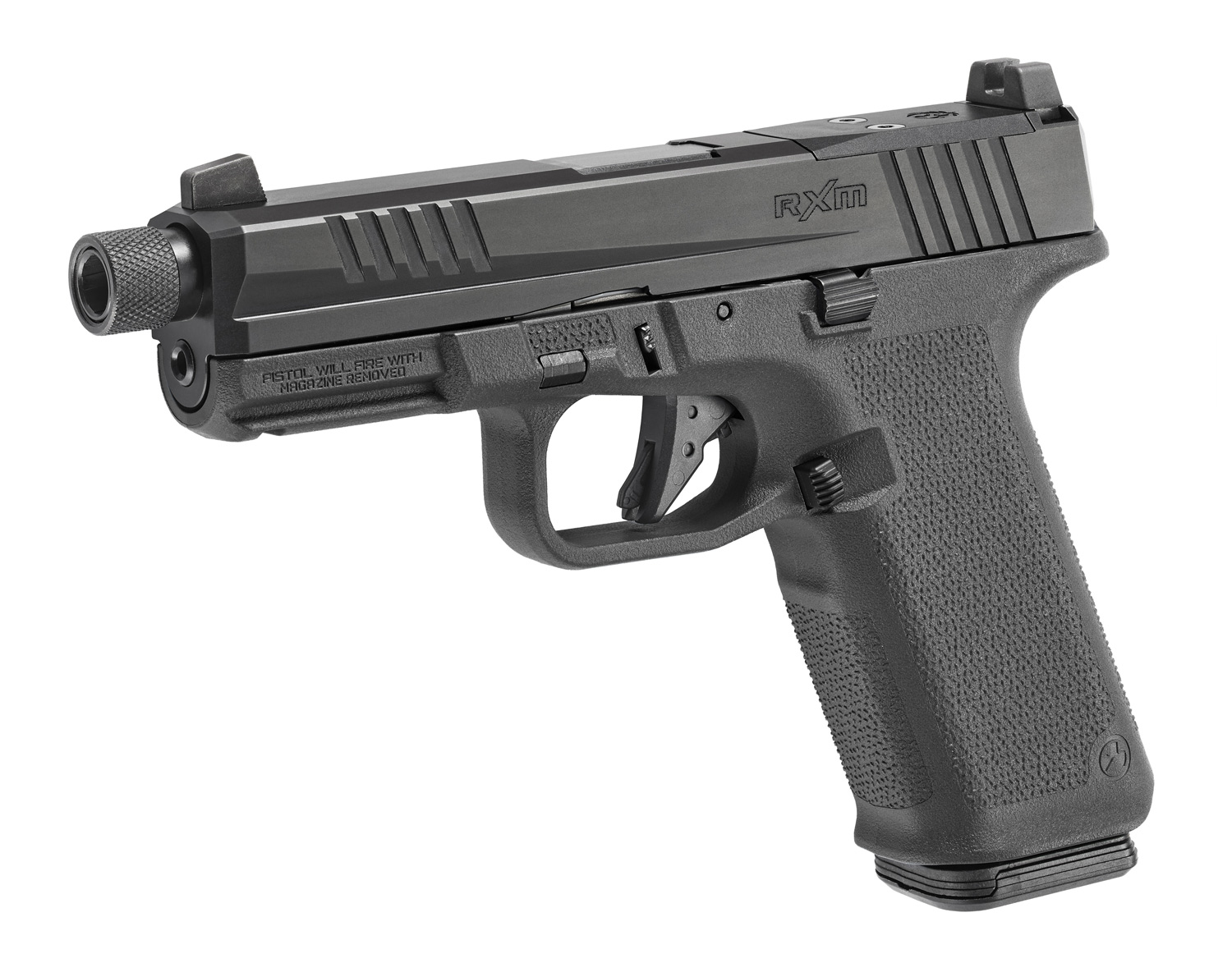 Extended magazine release and raised slide stop.