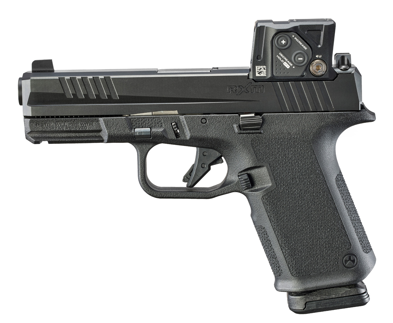 Extended magazine release and raised slide stop.