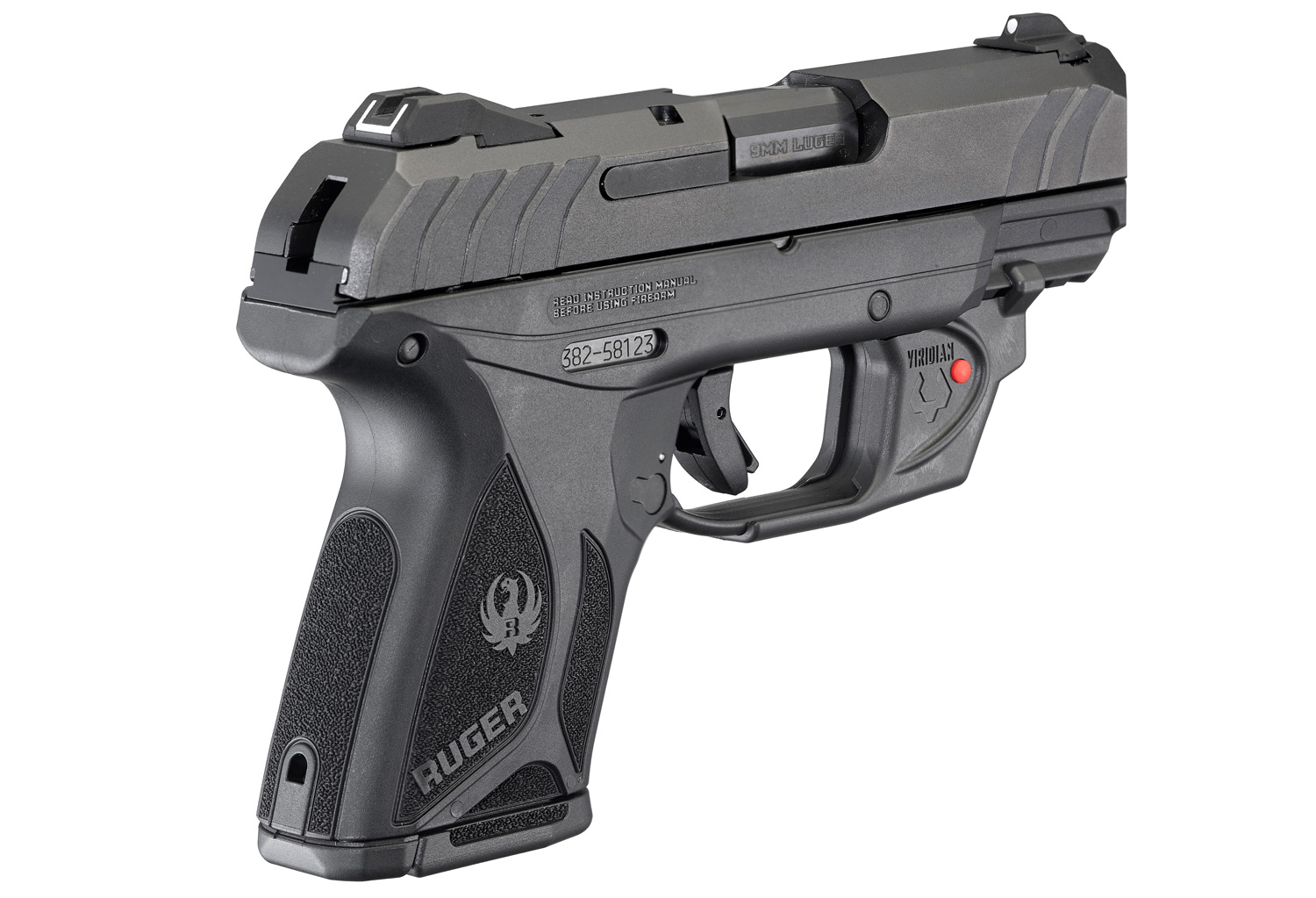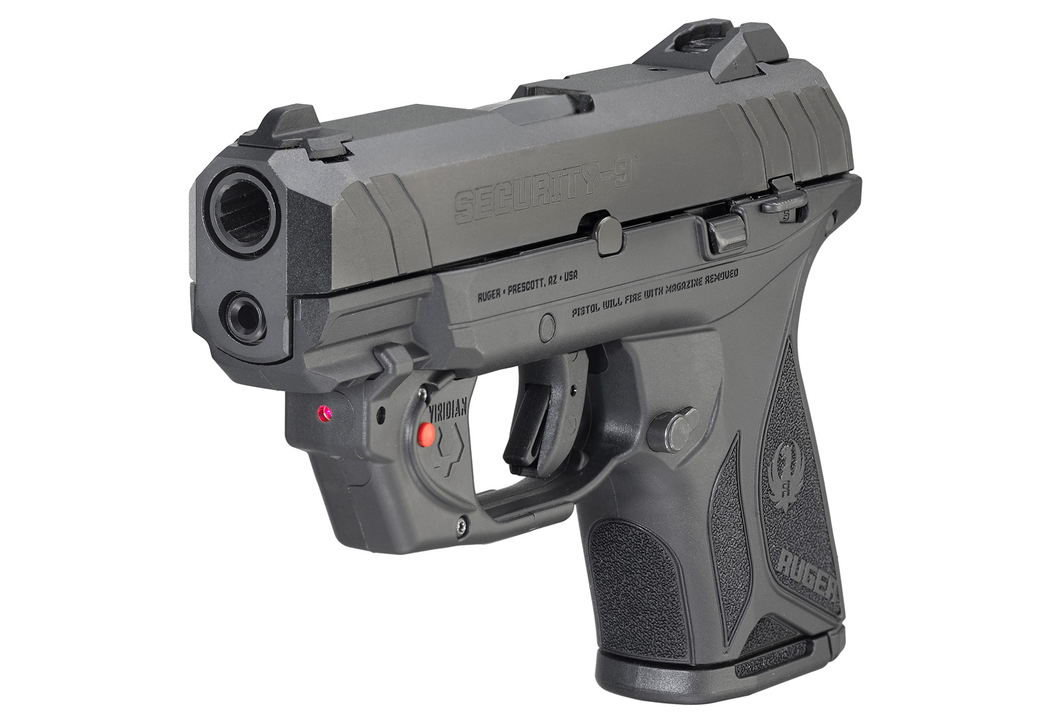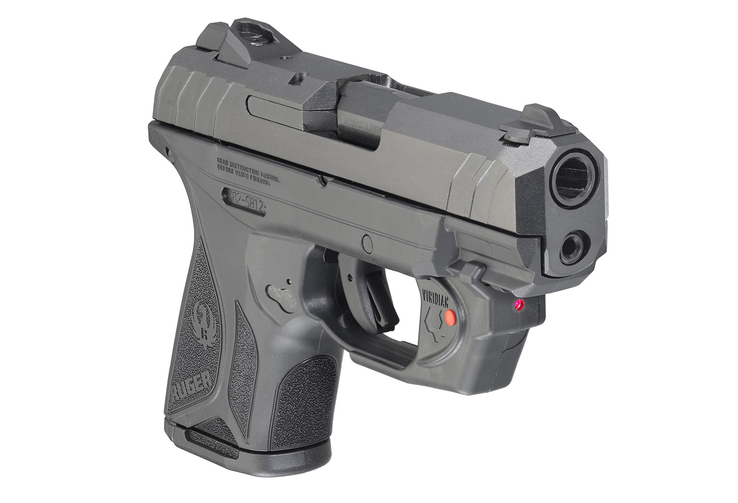 Factory installed Viridian® E-Series™ red (635-650 nm) laser. The laser unit weights just over 1/2 oz with the installed battery and is securely mounted to the rail and trigger guard. The laser features ambidextrous push-button activation.