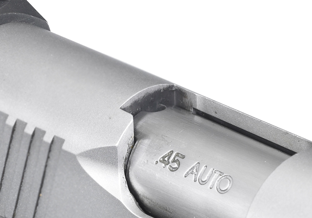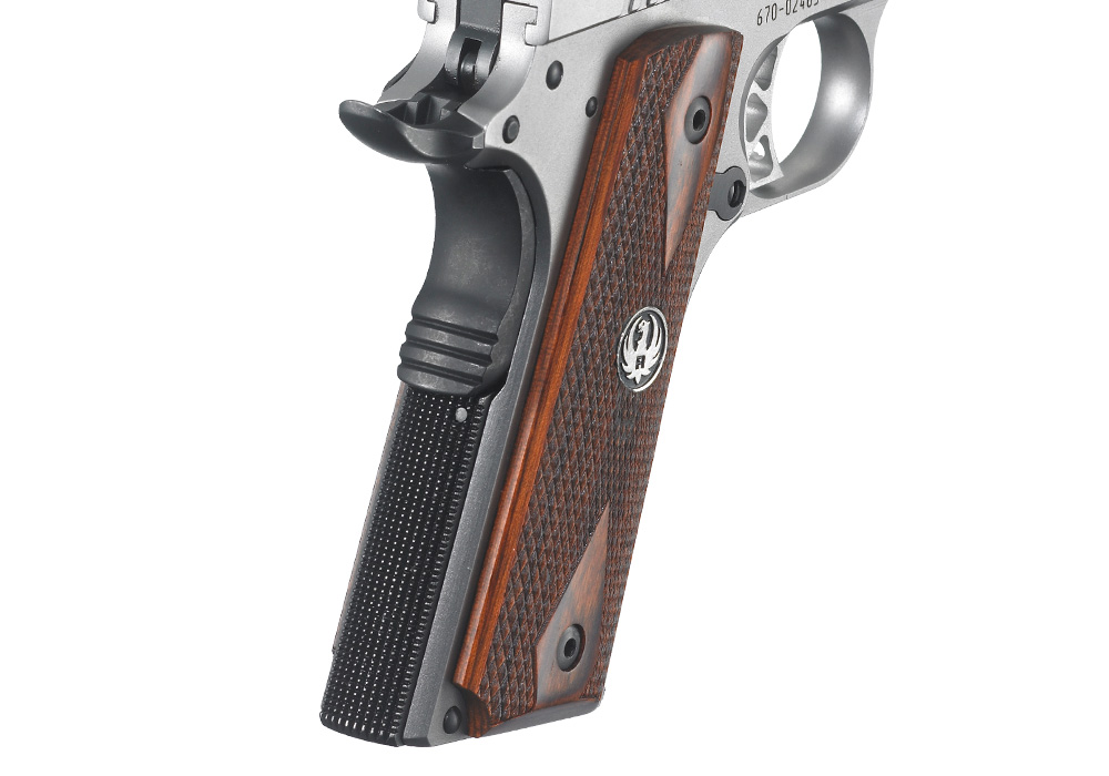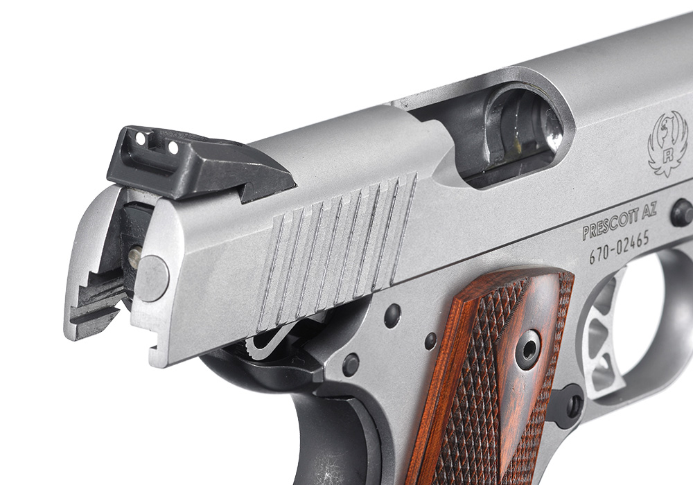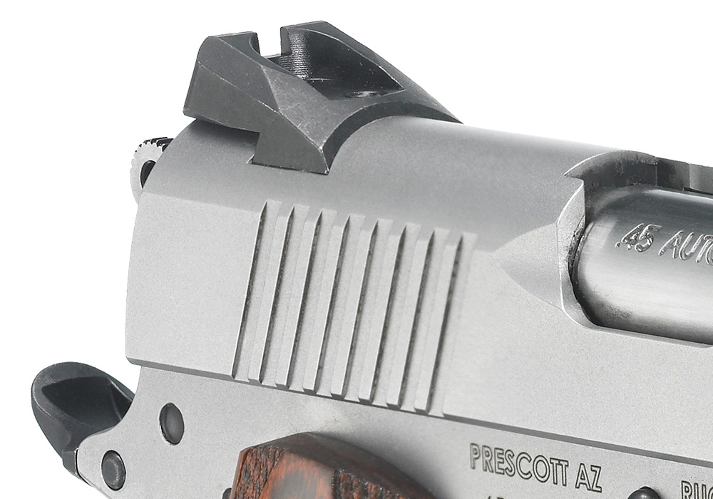 Features a flat mainspring housing and rear slide serrations for a positive grip.