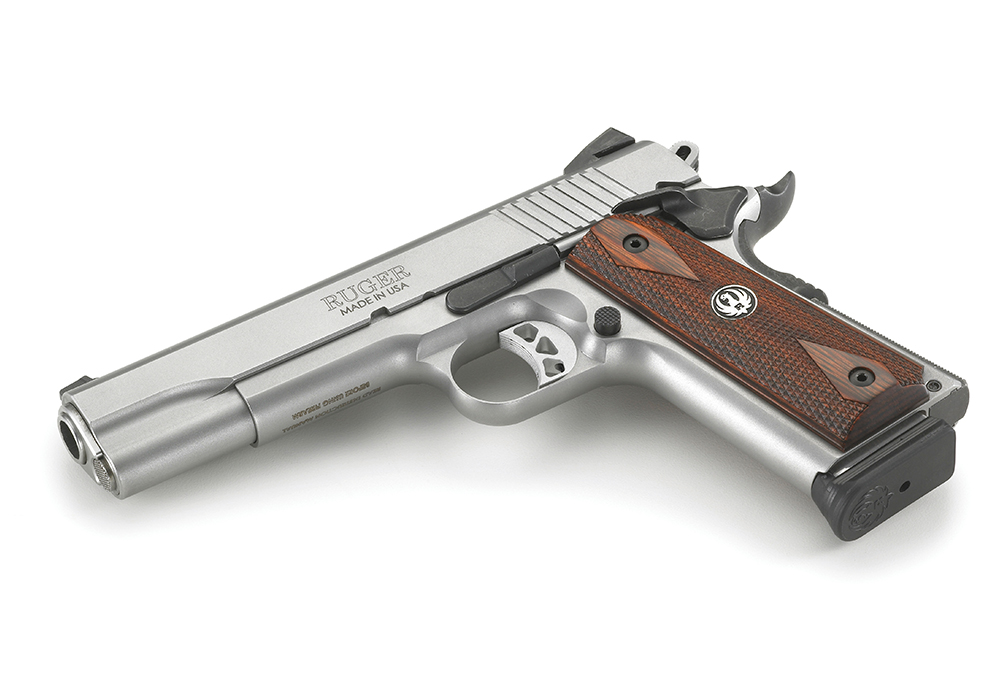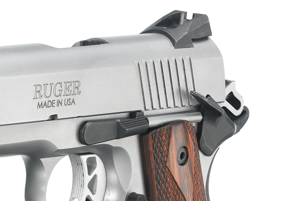 Features a flat mainspring housing and rear slide serrations for a positive grip.