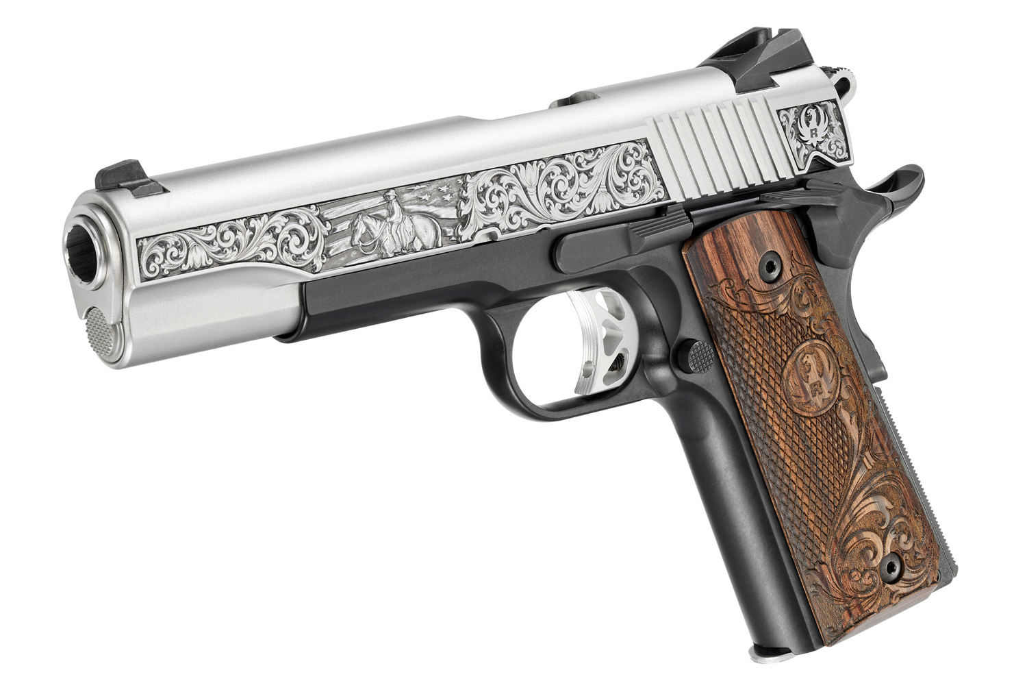 Features an attractive, finely detailed, laser-engraved slide that commemorates the Western genre featuring a mounted rider against an American flag backdrop.