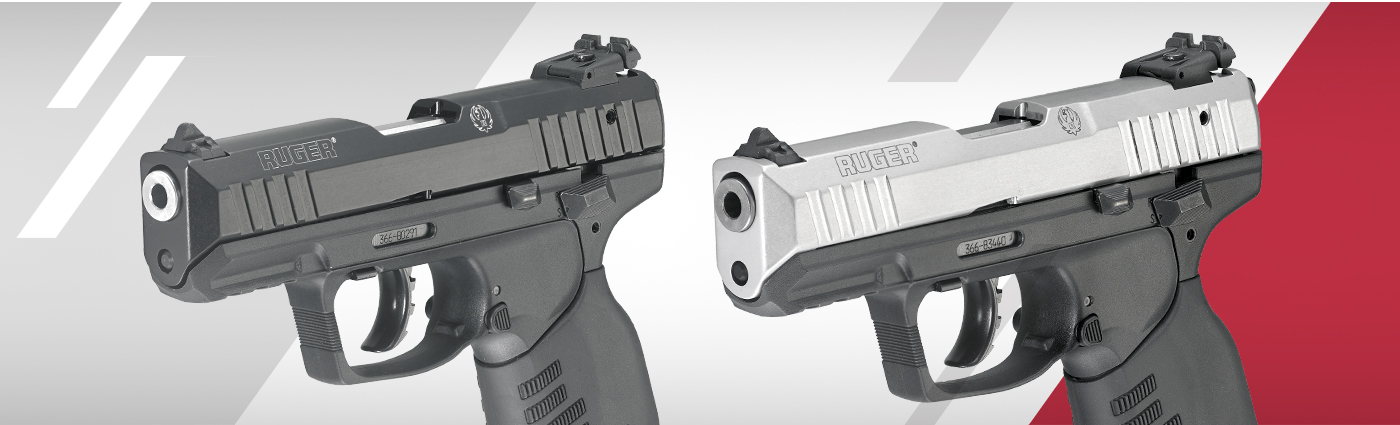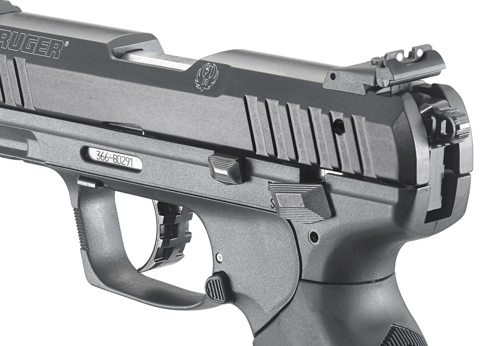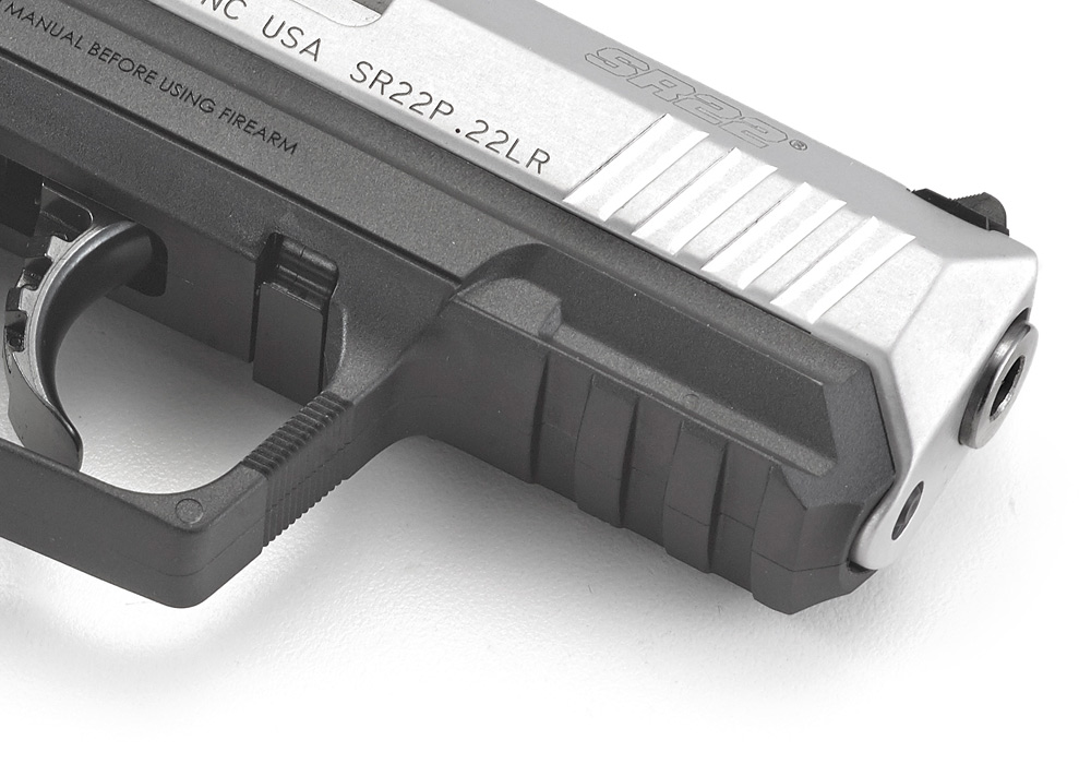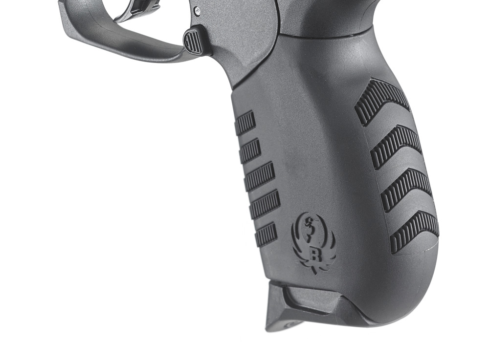 Polymer frame and two interchangeable rubberized grips with angled serrations allow shooters to select either a slim or wider palm swell option (no tools required).